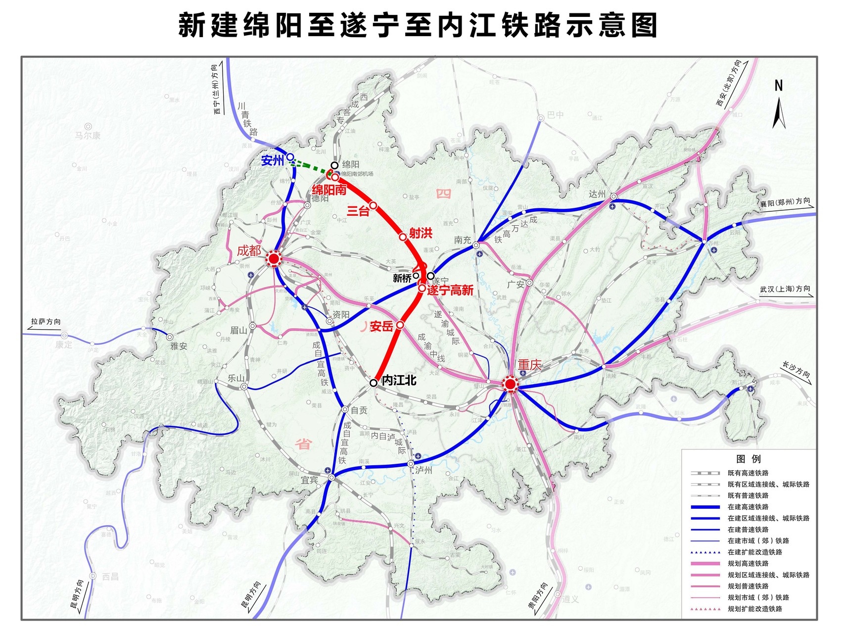 绵遂资内铁路线路以绵阳站为起点,终至内江北站,贯穿绵阳、德阳、遂宁、资阳、内江五市共11个县级行政区,正线全长287.9公里,设计时速250公里。项目建成通车后,将结束绵阳市三台县、遂宁市射洪市不通铁路的历史,进一步完善川北、川南、川中区域城际铁路环线,对于促进沿线区域社会经济发展,加快推动成渝地区双城经济圈综合交通运输体系建设具有重大意义。