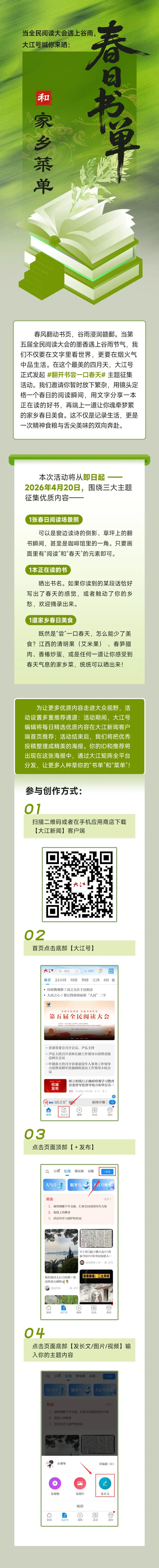 全民阅读,双倍春天等你来尝鲜! 今天,大江号 #翻开书尝一口春天# 征集持续升温!我们邀请你晒出你的春日书单+家乡菜单,让书香与饭香交织,感受精神食粮与舌尖美味带来的双重幸福。无论是触动乡愁的文字,还是记忆深处的家乡味,快来分享你的春日快乐,一起沉醉在这最美的四月天吧!