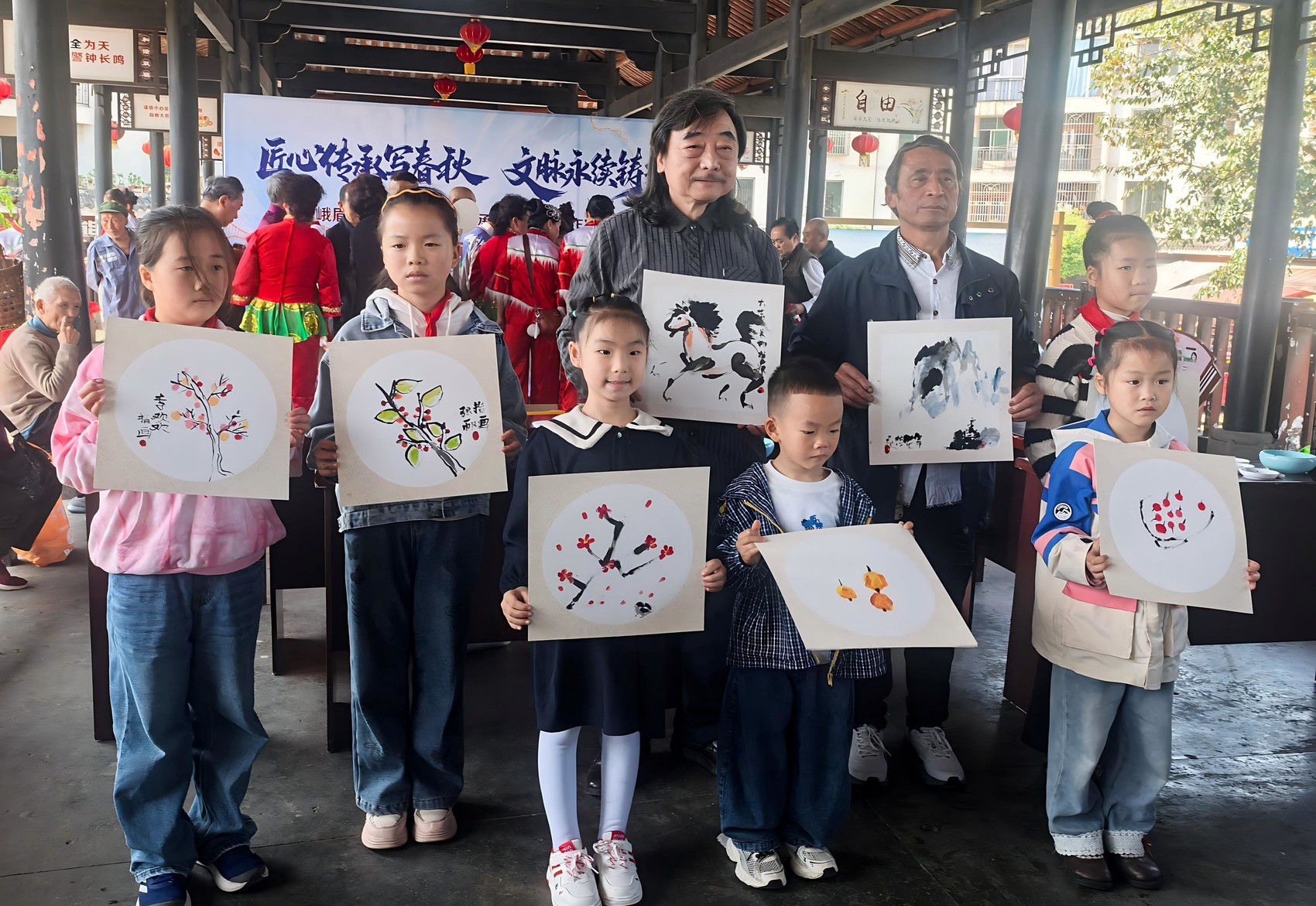参加活动的还有双福镇关工委的联系单位峨眉山市教育局关工委全体成员,双福镇关工委非遗传承“五老”工作室骨干成员、联系单位双福镇小学校长、春兰幼儿园园长,各相关非遗项目传承人和观众近百人欢聚一堂。