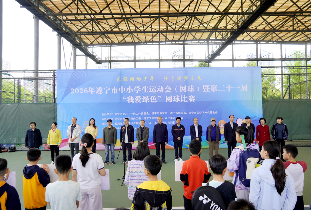 (文图/遂宁市关工委)4月11日,遂宁市关工委联合市教育局等部门,组织全市200余名青少年网球选手齐聚一堂,在体育中心举行遂宁市中小学生运动会暨第二十一届“我爱绿色”网球比赛。市关工委执行主任蒋海斌出席活动并宣布开幕。
