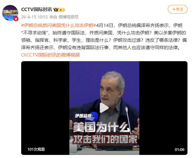 4月14日,伊朗总统佩泽希齐扬表示,伊朗“不寻求动荡”,始终遵守国际法,并质问美国,凭什么攻击伊朗?美以杀害伊朗的领袖、指挥官、科学家、学生,理由是什么?伊朗攻击过谁?违反了哪条法律?佩泽希齐扬还表示,伊朗没有违背国际法行事,而其他人也应该遵守同样的法律。