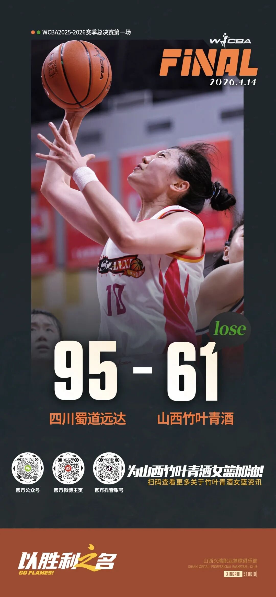 4月14日,2025-2026赛季WCBA联赛季后赛总决赛展开首场争夺,山西竹叶青酒女篮客场以61比95不敌四川队。