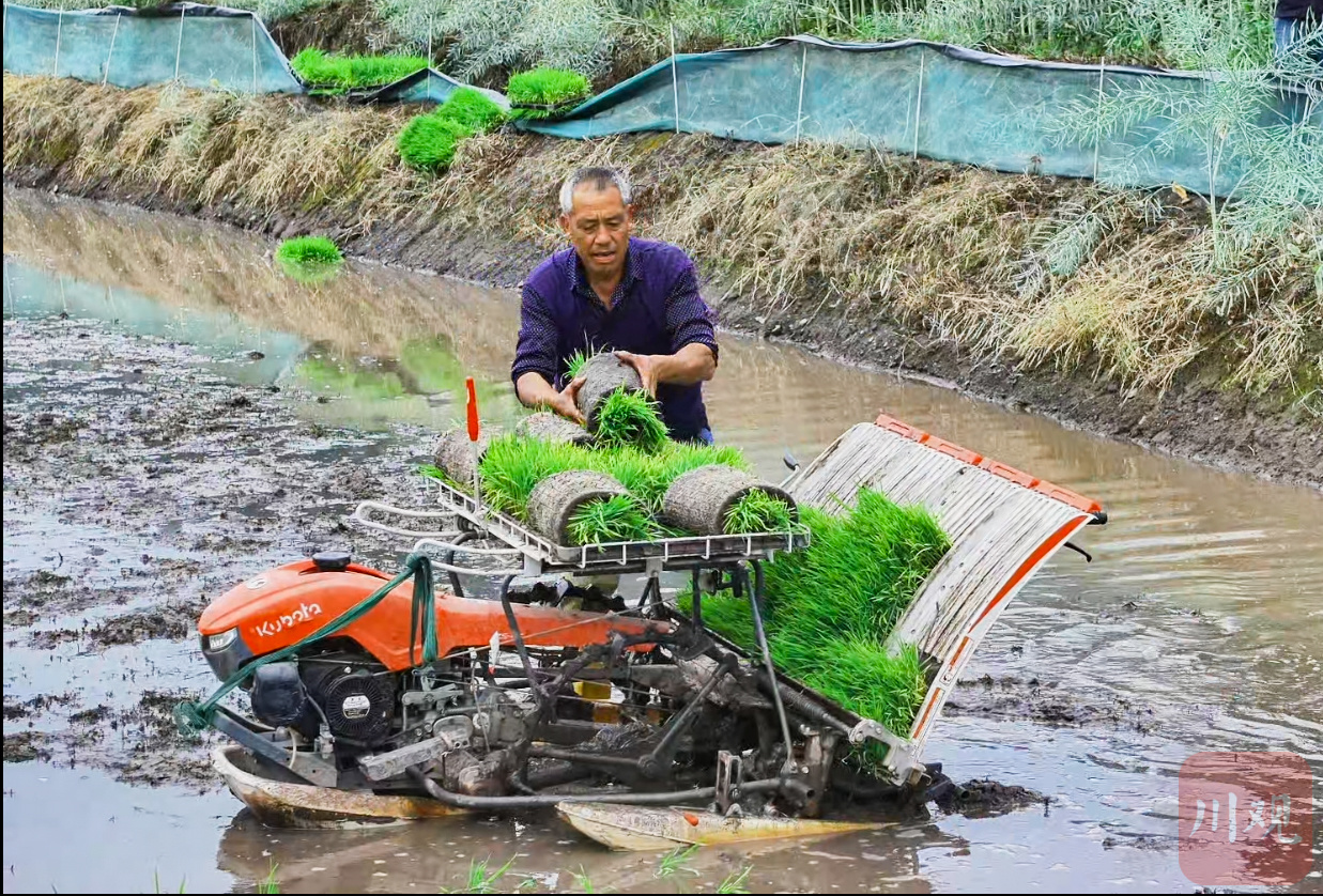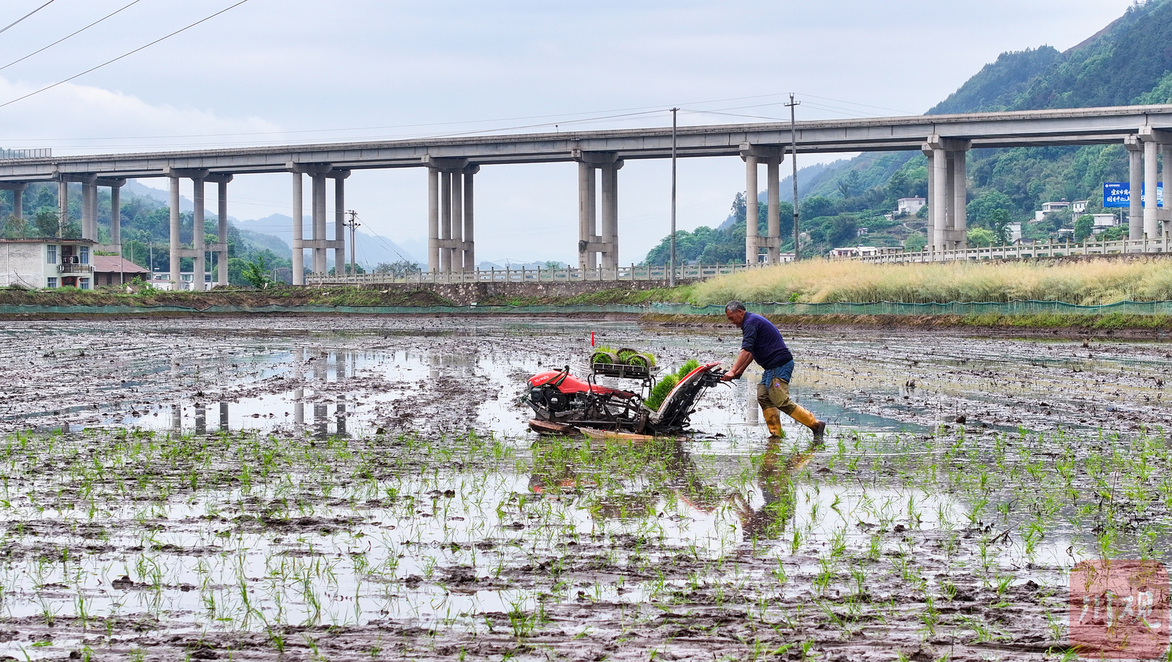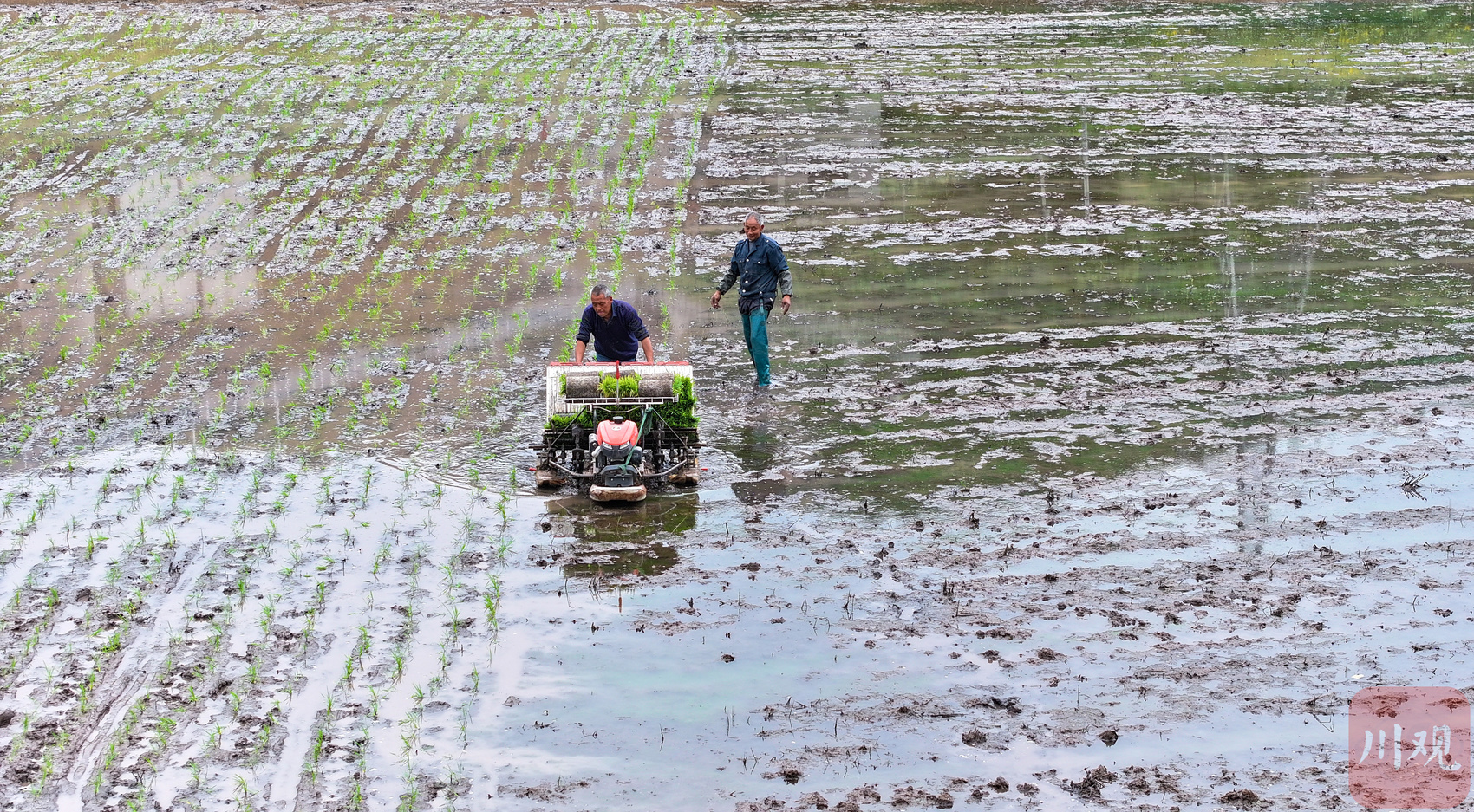 4月14日,宜宾市高县庆岭粮油现代农业园区桥坎段水田里,两台手扶式水稻插秧机正匀速行进。随着秧盘转动,一株株秧苗整齐地插入田里,不到半天时间,大片水田已铺满新绿。