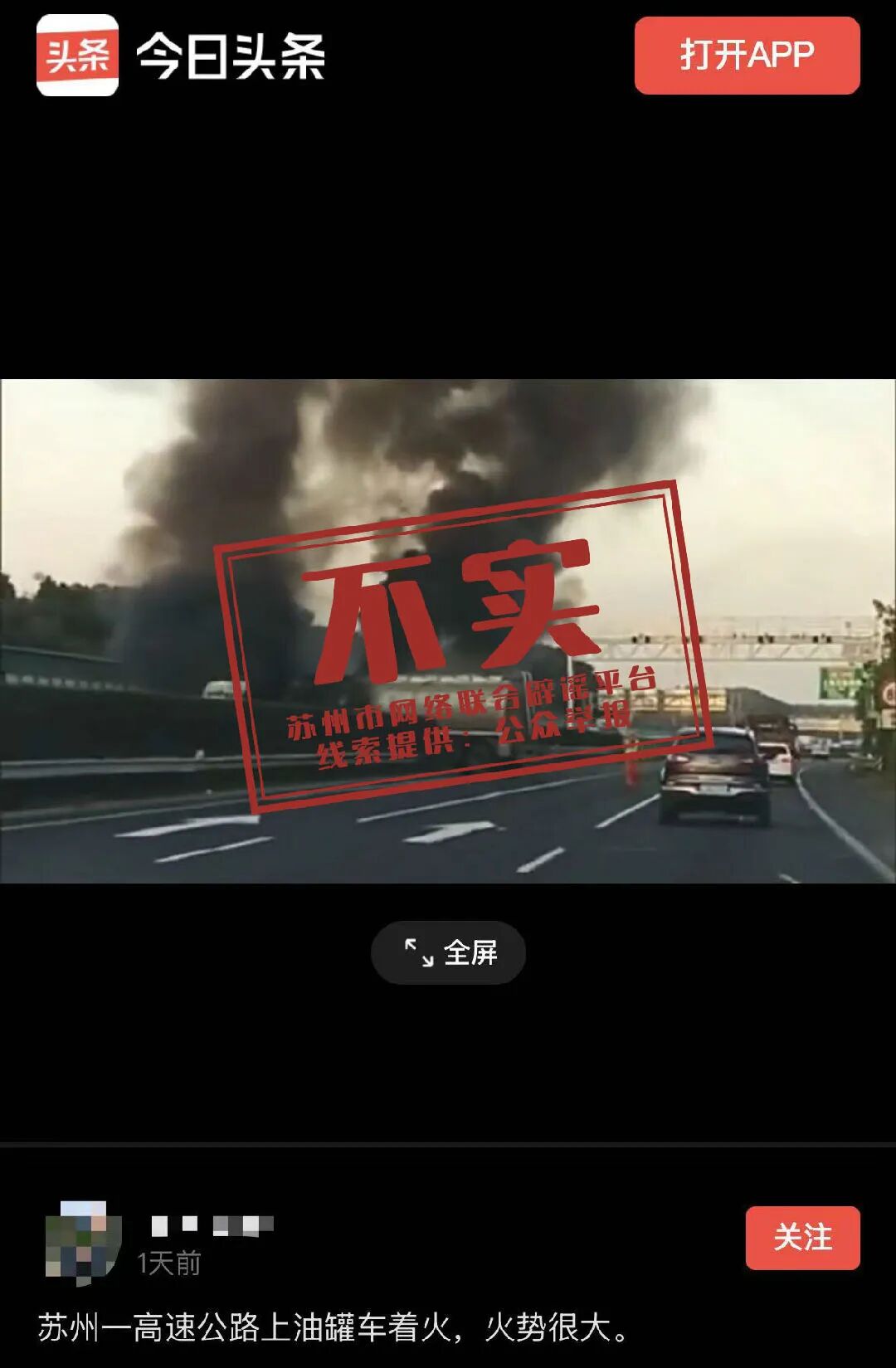 近日,网传苏州一高速公路上油罐车着火。经消防部门核实,近日未发生相关火情,为谣言。