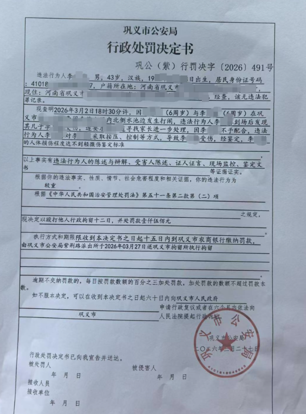 董女士提供的《行政处罚决定书》显示,43岁的李某因两个孩子打闹,发现自己孩子受伤,要求小磊寻找家长处理时小磊不配合,对小磊采取了按压、控制方式,导致小磊受伤;经鉴定,小磊伤情达不到轻微伤标准;鉴于李某违法行为较重,对其处以行政拘留十二日并罚款一千五百元处罚;3月27日,李某被送至巩义市拘留所执行拘留。