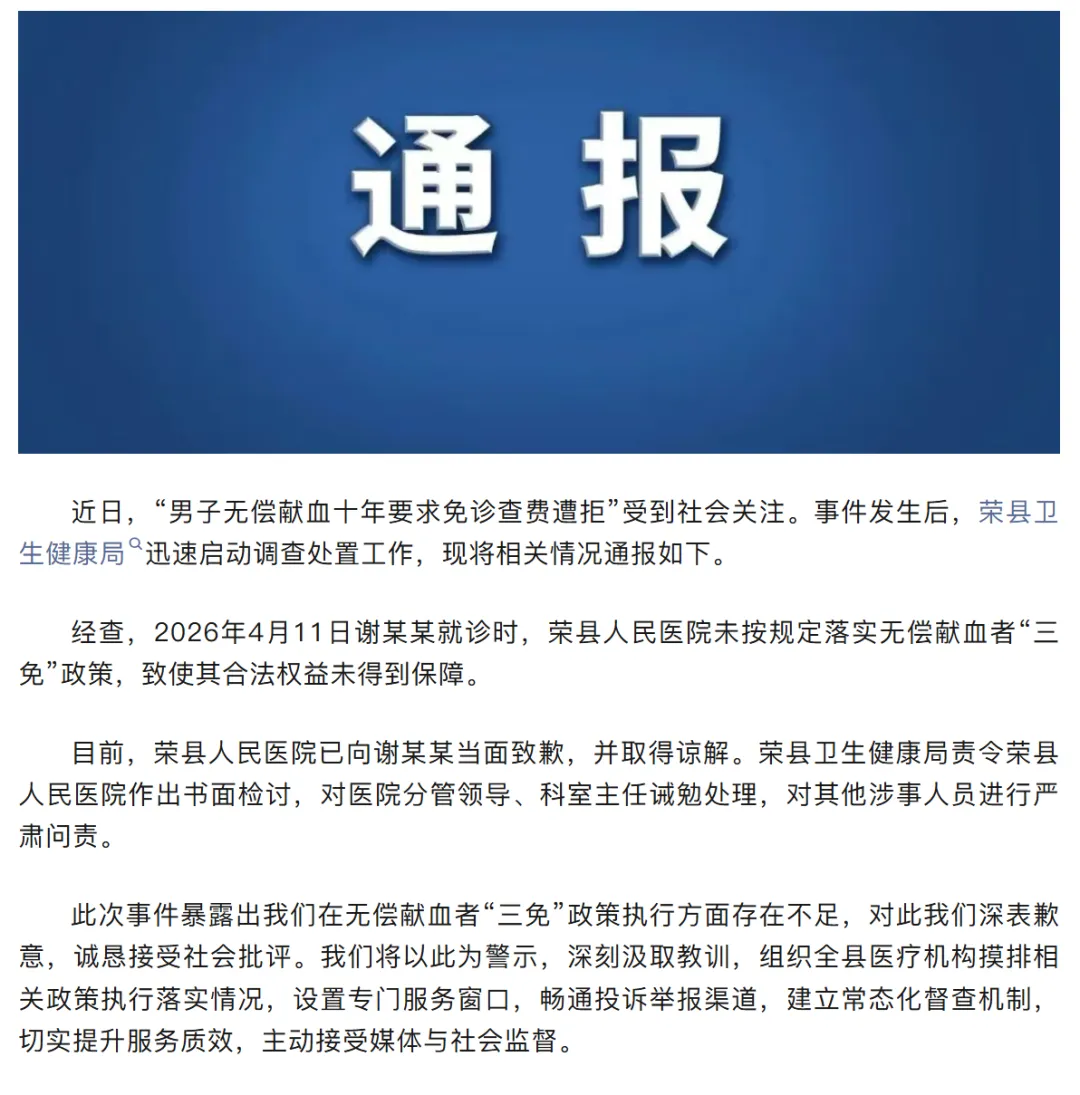 4月14日,荣县卫生健康局发布情况通报,已向谢先生当面致歉,并取得谅解。荣县卫生健康局责令荣县人民医院作出书面检讨,对医院分管领导、科室主任诫勉处理,对其他涉事人员进行严肃问责。