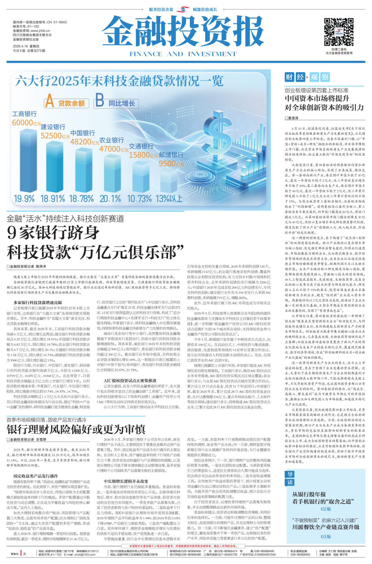 随着A股上市银行2025年年报的陆续披露,银行业落实“五篇大文章”首篇科技金融的最新进展浮出水面。金融投资报记者梳理已披露年报的22家上市银行数据发现,科技贷款增速明显,已披露银行科技贷款余额规模已接近30万亿元。此外,目前科技贷款余额超过万亿元的上市银行已增至9家,分别为工商银行、建设银行、中国银行、农业银行、交通银行、兴业银行、中信银行、浦发银行、招商银行。