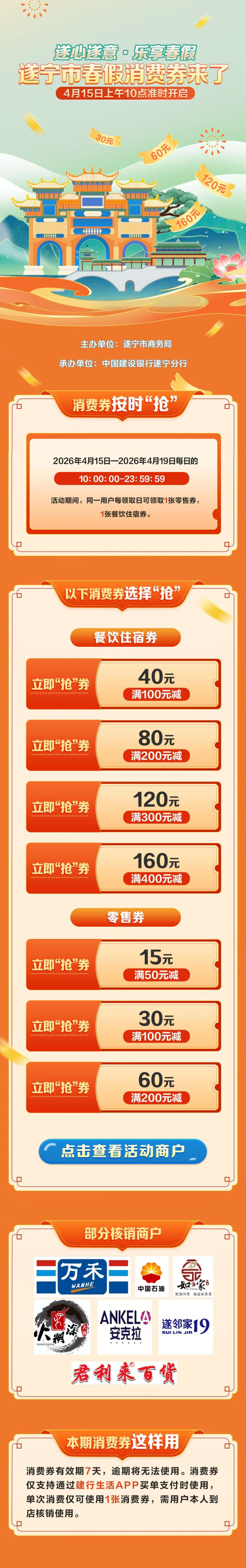 4月15日至4月19日,遂宁市将发放总额100万元的“遂心遂意·乐享春假”消费券。本次活动由遂宁市商务局主办,依托“建行生活”APP平台,面向遂宁全市范围发放,涵盖餐饮、住宿、零售等重点消费领域,以期进一步激发市场消费活力、提振市场信心。