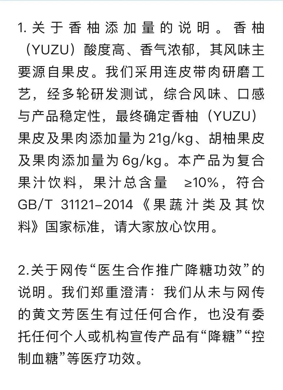 宋柚汁通过其官方号发声表示,宋柚汁是复合果汁饮料,果汁总含量≥10%,符合GB/T 31121-2014《果蔬汁类及其饮料》国家标准,请大家放心饮用。并对网传“医生合作推广降糖功效”以及宣传修改等做了说明。