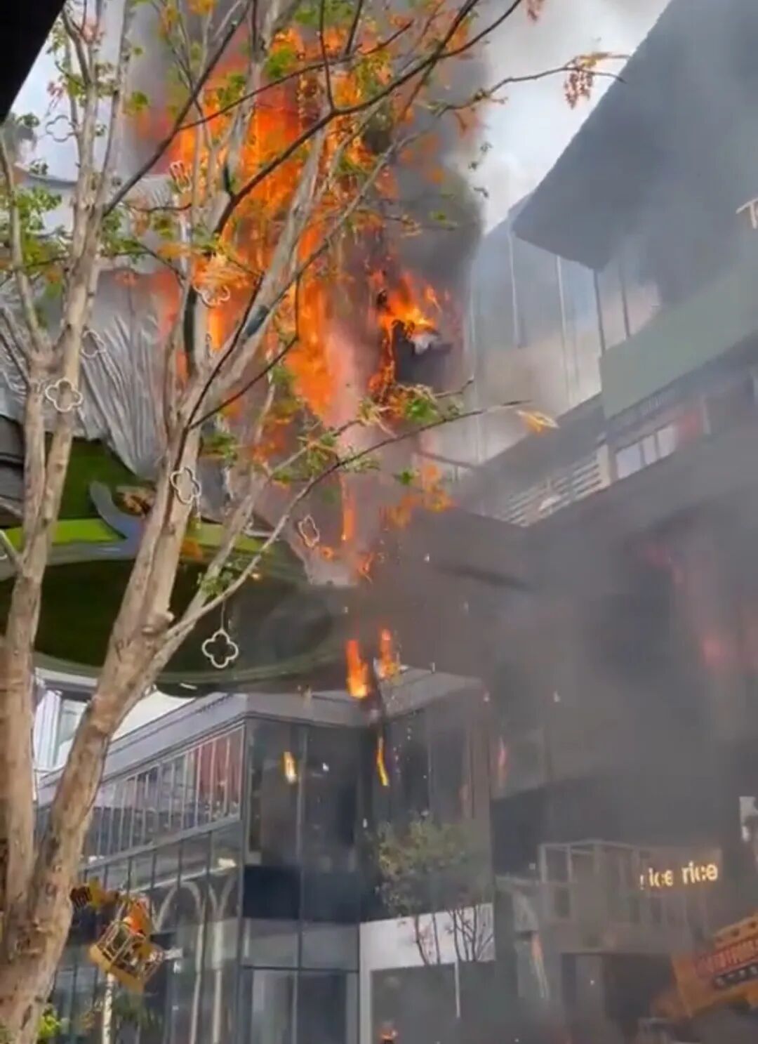 4月15日上午,有网友发视频称苏州万象天地一设立在高处露天走廊上的绿色装饰物发生火情,根据视频,现场浓烟滚滚、火势较大,有大量火星溅到地面。网友在视频中表示,有消防车到现场。