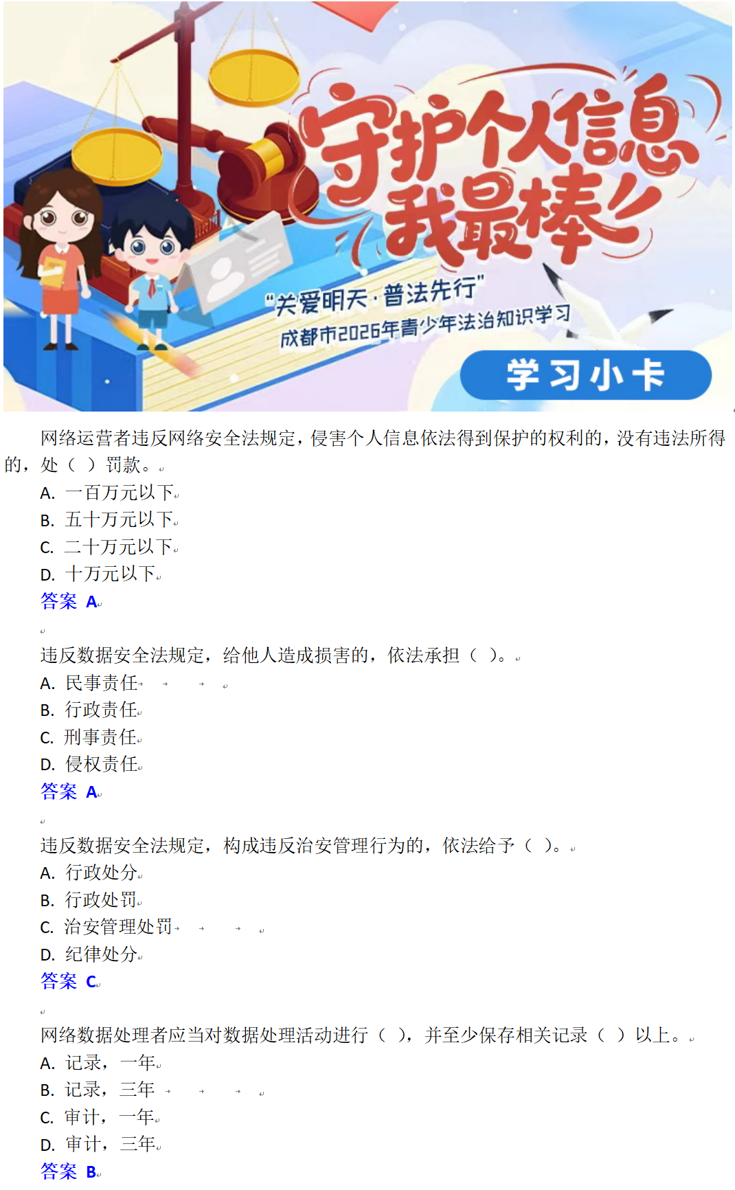 “关爱明天·普法先行”成都市2026年青少年法治知识学习火热进行中,川观新闻推出每日学习卡帮助大家学习。每一张卡片,都是一个超实用的“法律锦囊”。学会这些,你就能做自己安全的第一责任人!
