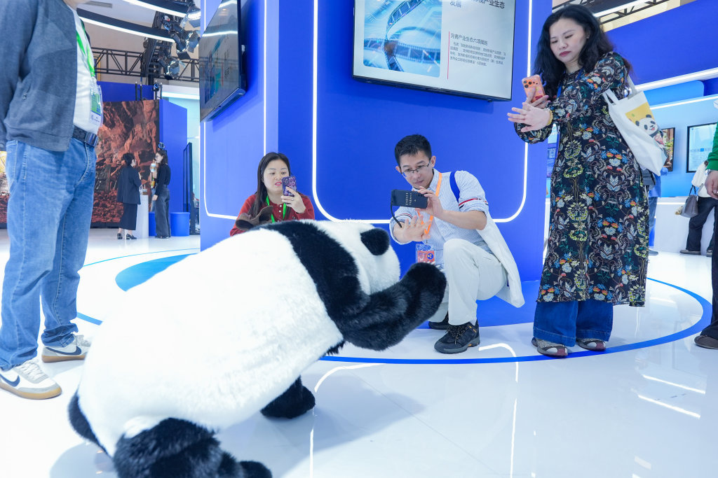 4月15日,参会者在创新展交区和仿真机器熊猫互动。
