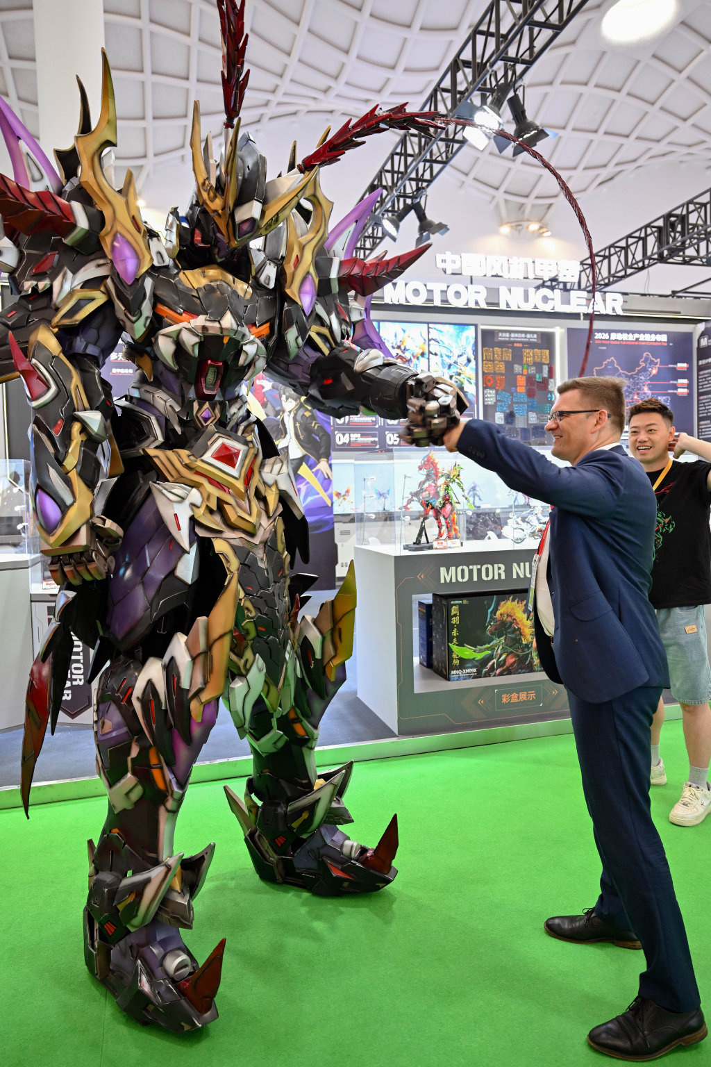 4月14日,一名外国参观者在第六届消博会现场与中国风机甲人偶互动。