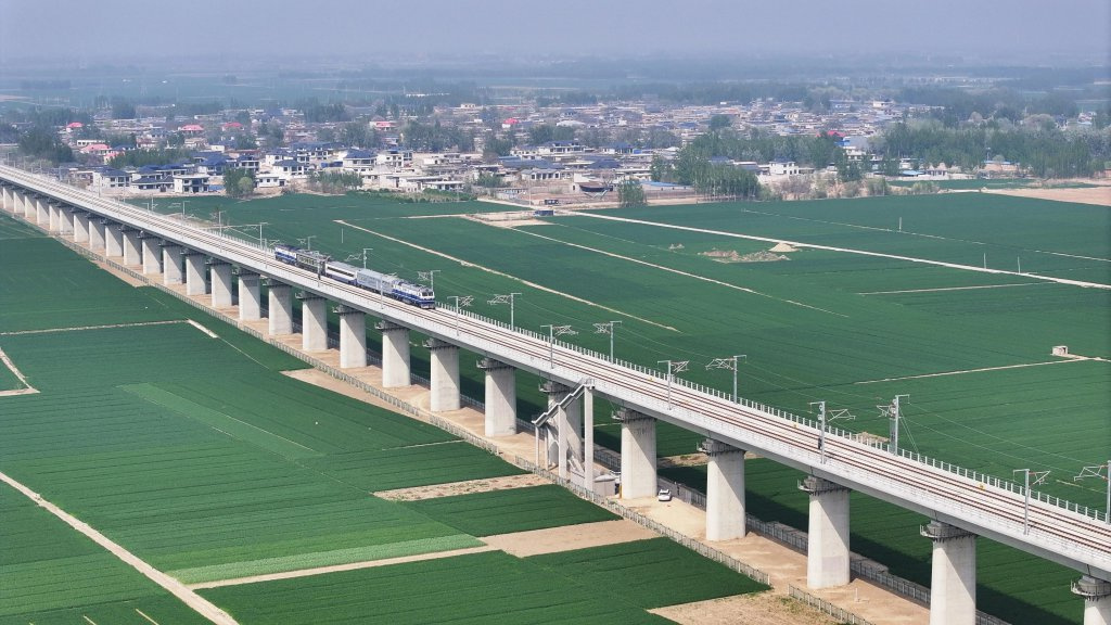 4月15日,检测列车通过雄商高铁任丘特大桥(无人机照片)。