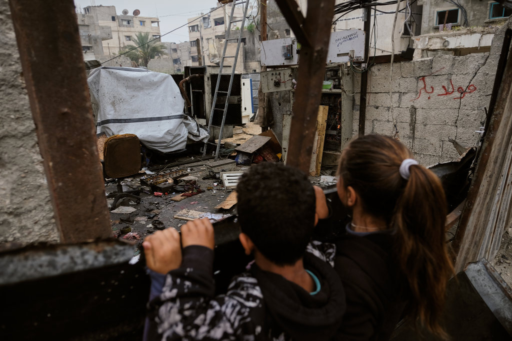 4月15日,在加沙城,巴勒斯坦儿童查看遭以色列袭击损毁的房屋。