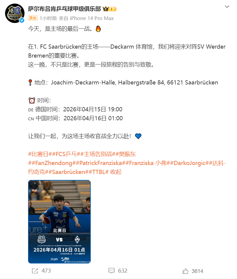 北京时间16日凌晨1点,樊振东将迎来在萨尔布吕肯俱乐部主场的收官告别战。@萨尔布吕肯乒乓球甲级俱乐部发博表示:这一晚,不只是比赛,更是一段旅程的告别与致敬。