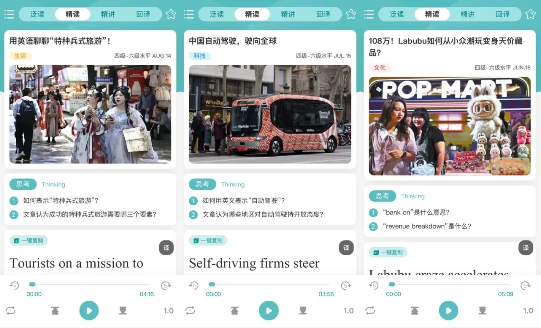 我们更新了1200篇+精读课程,精选50万字+的英语新闻原文,录制24000分钟+的有趣精讲。每篇课程的精讲音频在20分钟左右,非常轻量化,很容易坚持,养成良好的学习习惯。