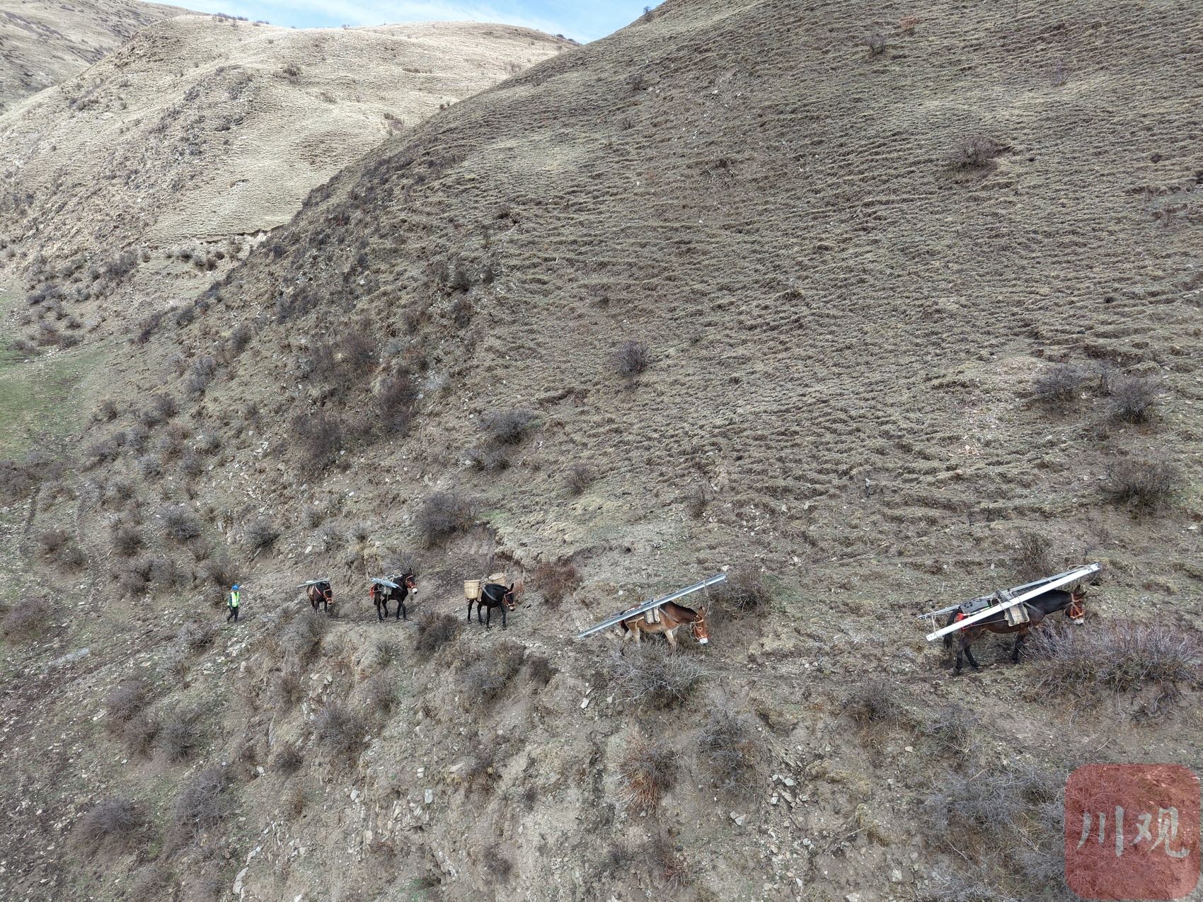 马帮驮运着塔材,穿行在无人区的高山之间。(摄 张懿玲)