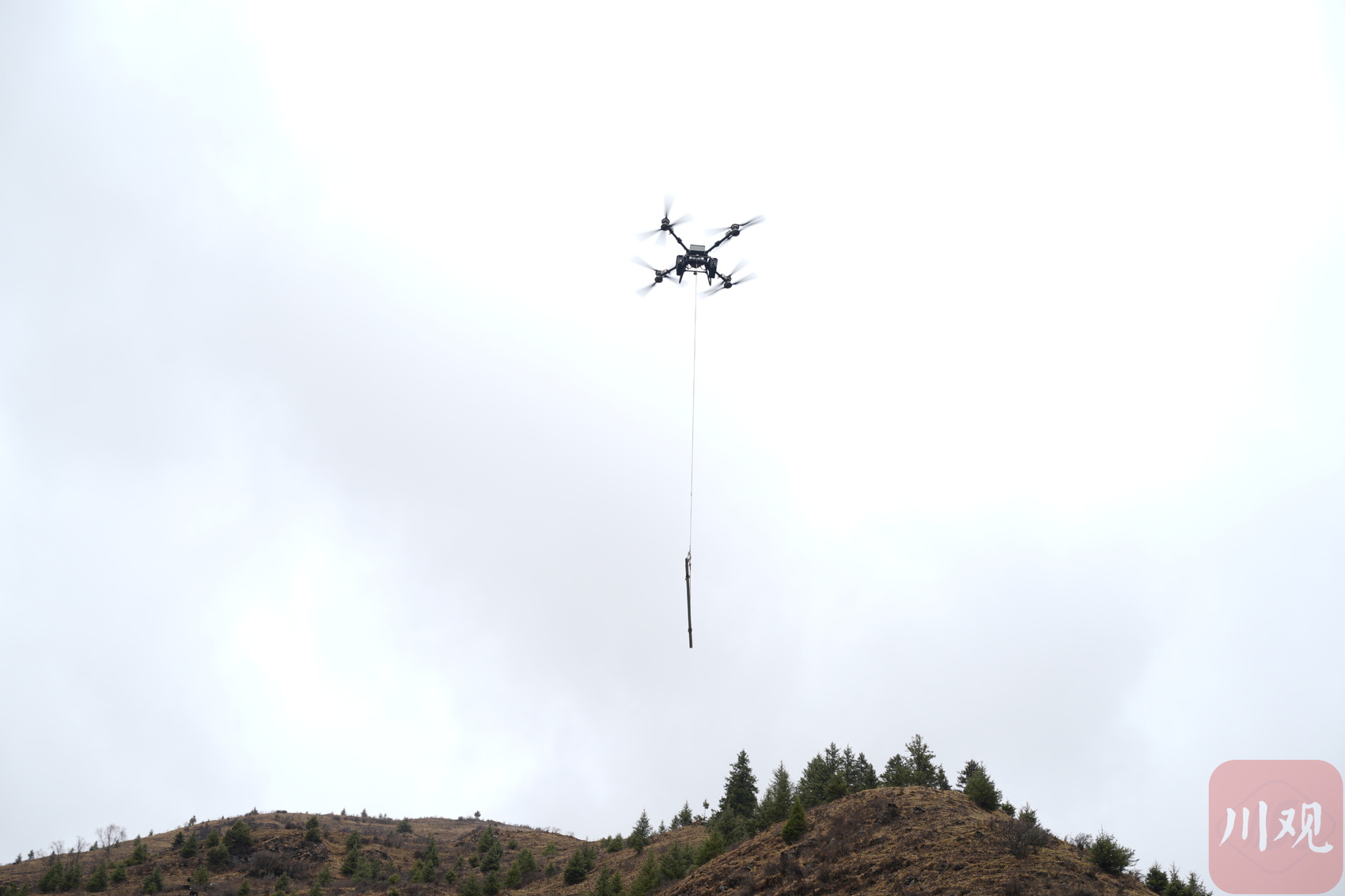 国网阿坝供电公司首次引入大型无人机,单次可吊运200公斤塔材或砂石。(摄 张懿玲)