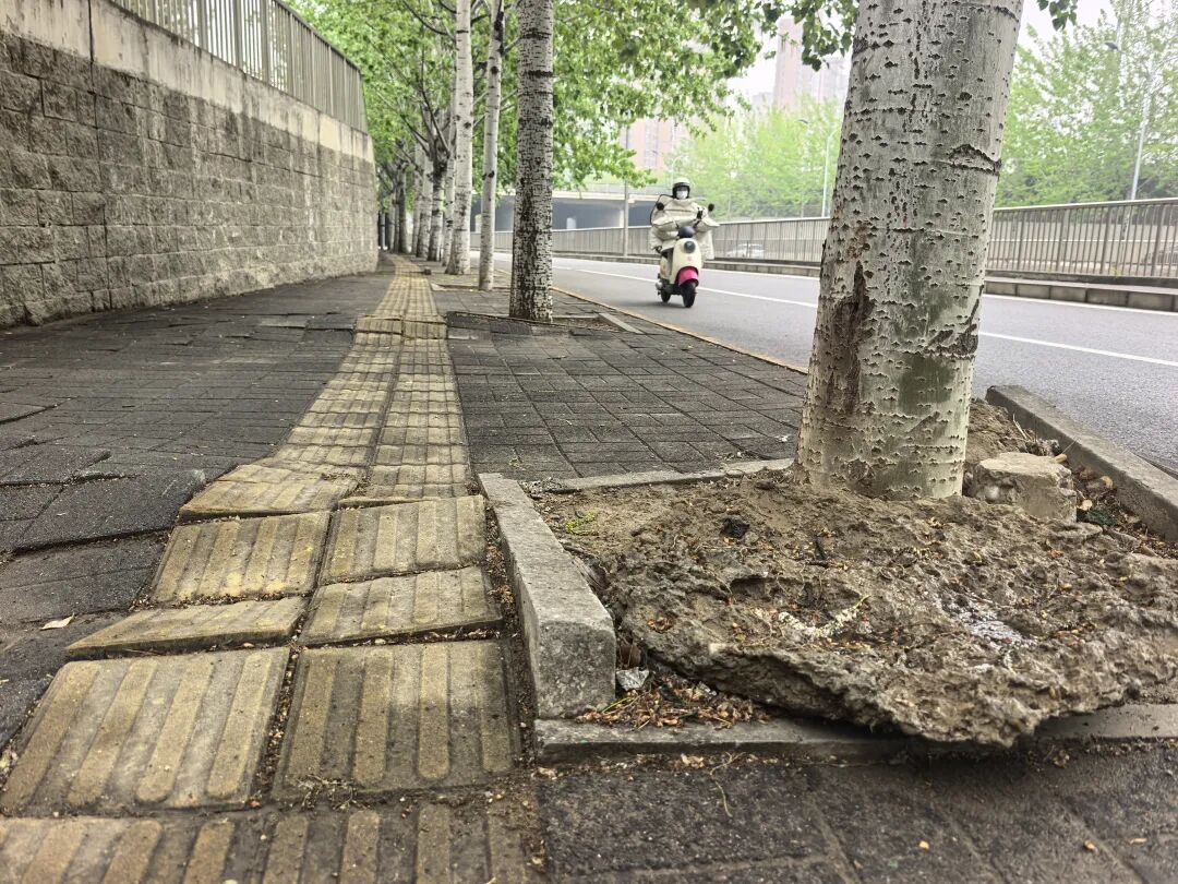 马路对面,情况同样不容乐观。在来广营地区滨河公园入口旁,人行道上鼓起一个个“大包”。就连盲道也未能幸免,部分地砖移位或缺失后,露出下面盘根错节的树根。