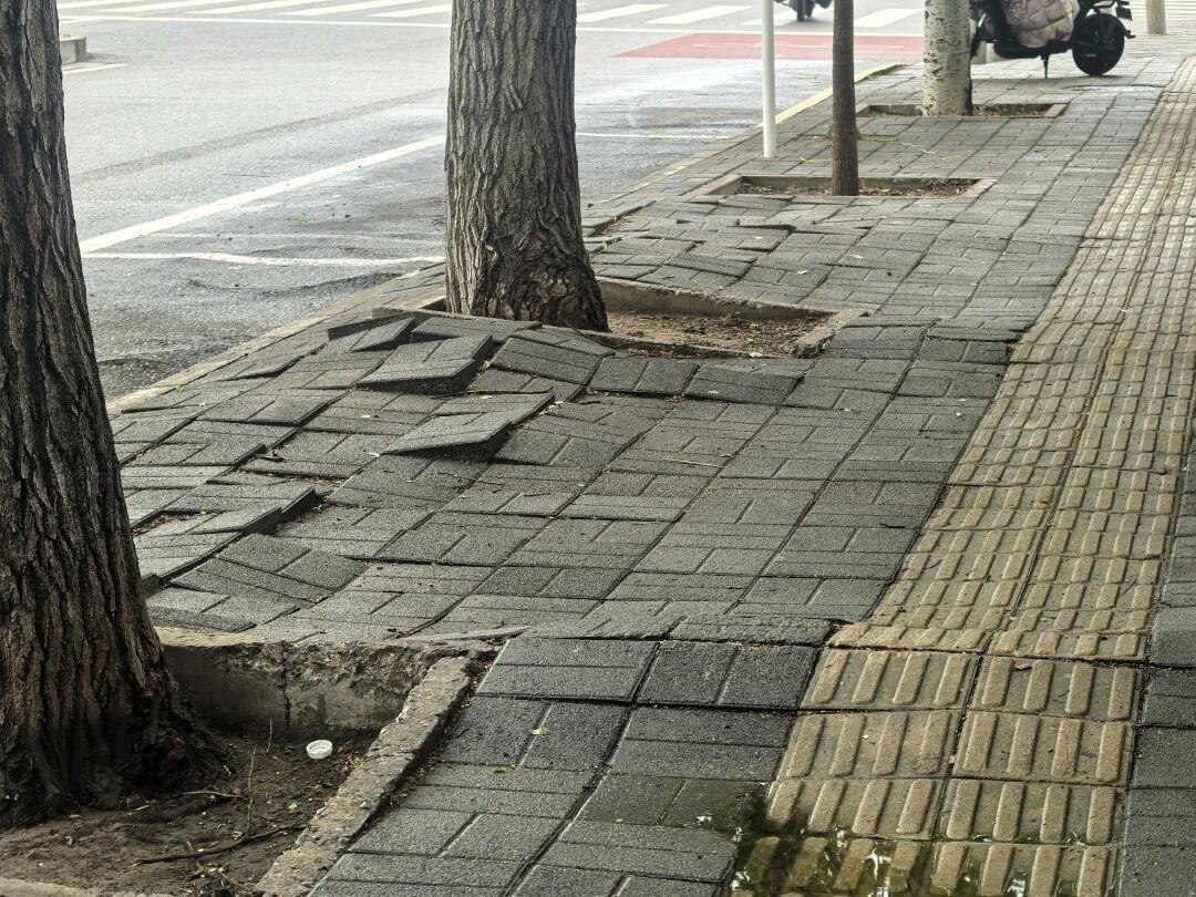 春日万物复苏,草木萌芽吐绿,地下根系也在悄然生长。然而,一些行道树的根系将人行道的地砖拱起,让原本平整的路面变得凹凸不平,给市民出行带来诸多不便。