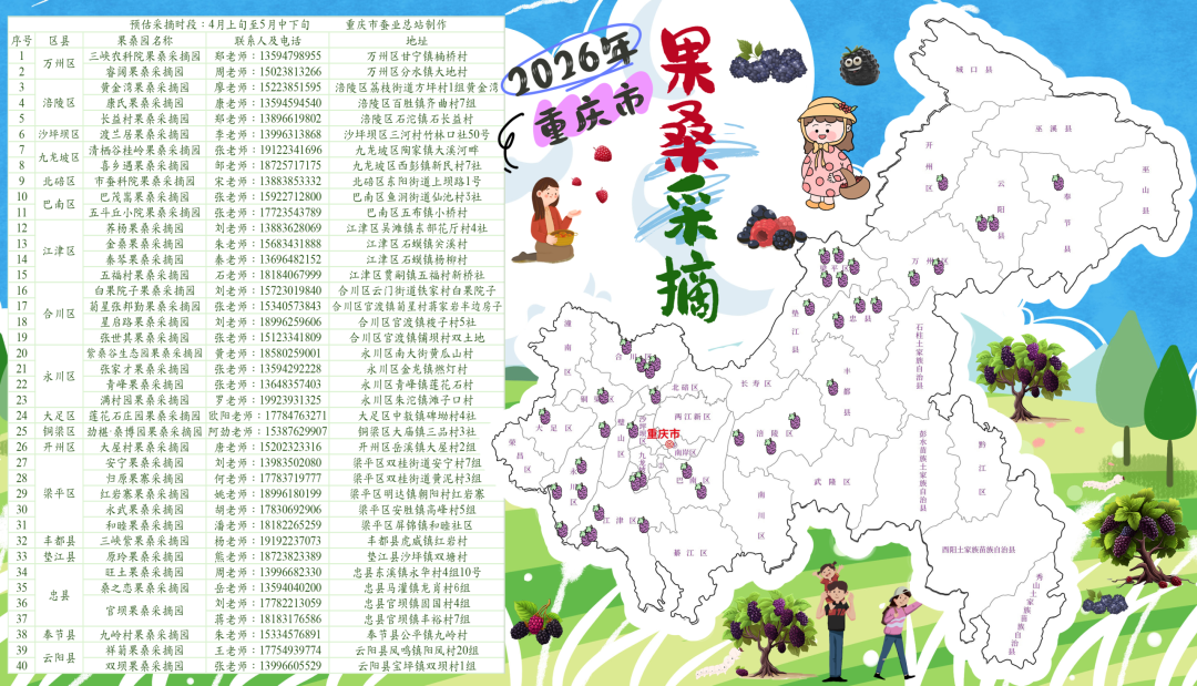 记者从重庆市商务委获悉,市蚕业总站正式发布全市18个区县40个果桑采摘园信息,为市民打造一站式田园采摘指南。