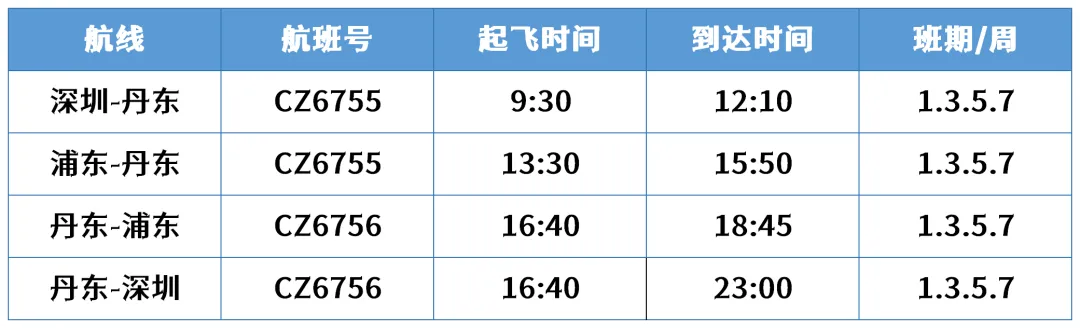 4月26日起,丹东⇋上海⇋深圳往返,南方航空公司执飞