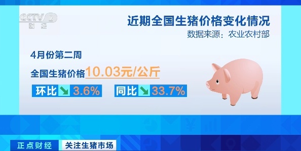 农业农村部数据显示,4月份第二周全国生猪价格为每公斤10.03元,环比下降3.6%,同比下降33.7%。