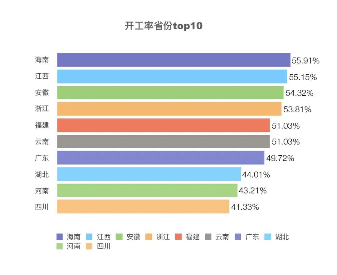一季度全国工程机械平均开工率为34.40%,排名前十的省份分别是:海南、江西、安徽、浙江、福建、云南、广东、湖北、河南、四川。