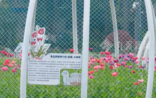 目前,罂粟集中种植于园内200平方米封闭铁笼内,游客仅能笼外观赏;当前正值盛花期,笼旁虞美人同步盛开,为公众辨别学习提供场景,避免误种或误报案。