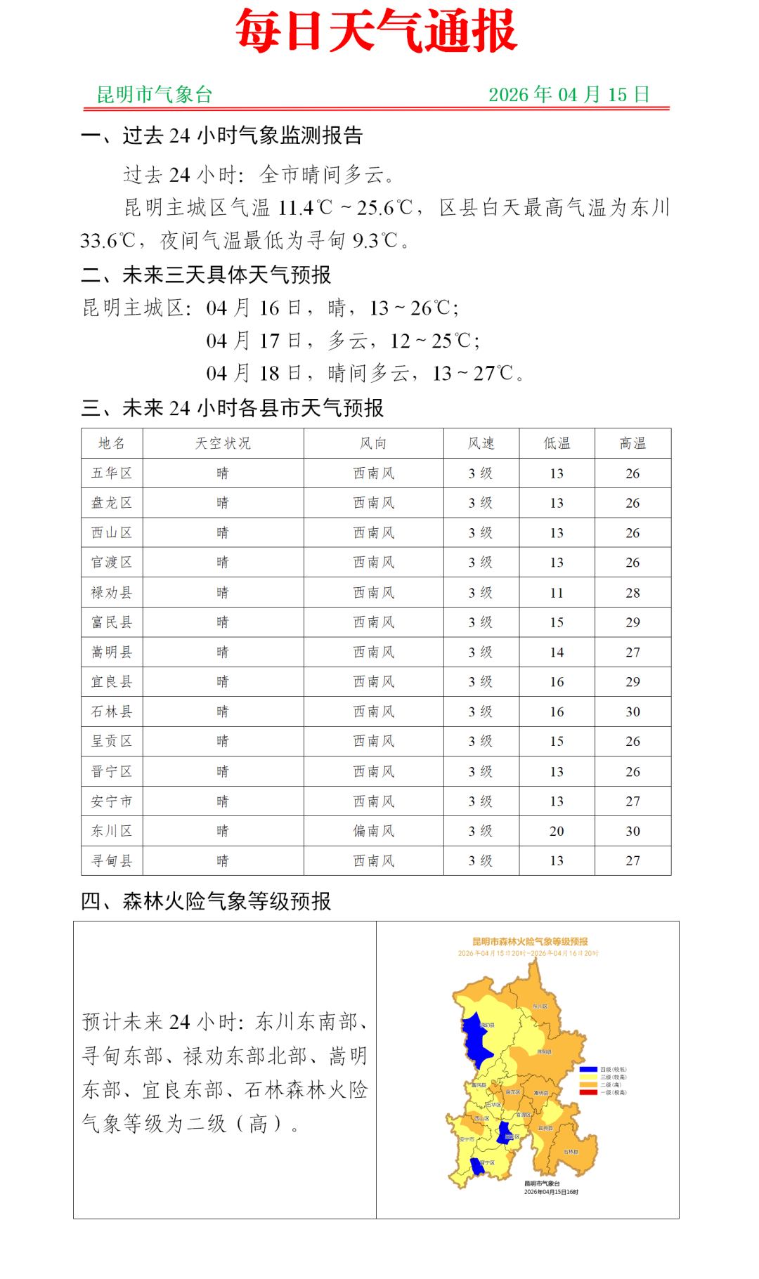 预计2026年4月15日20时至4月16日20时,丽江市东南部、大理州东北部、楚雄州中部、昆明市中南部、玉溪市东部、红河州中北部、文山州西北部、曲靖市西南部二级(高),丽江市大部、大理州西部和南部、临沧市东北部、普洱市大部、西双版纳州、楚雄州东北部和西部、昆明市北部、玉溪市中西部、红河州南部、文山州东部和南部、曲靖市中部三级(较高),其他地区四级(较低)。