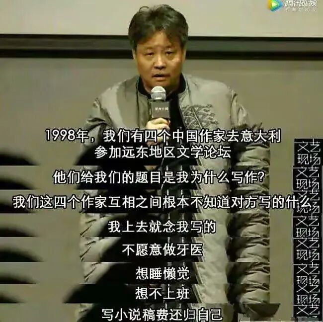 在意大利远东文学论坛上,被问“为什么写作”,莫言说“为了买皮鞋”,余华说“为了睡懒觉不上班”,王朔说“为了追漂亮的护士”,把一旁“热爱文学”的苏童整不会了。