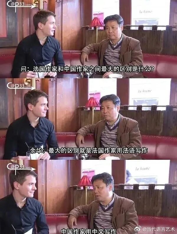 有记者问“中国作家和法国作家最大的区别是什么”,余华脱口而出:“法国作家用法语写作,中国作家用中文写作。”