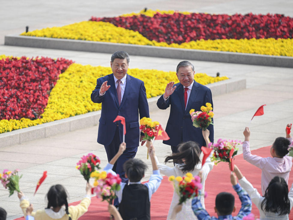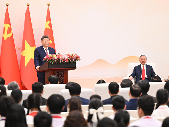 4月15日,中共中央总书记、国家主席习近平同越共中央总书记、国家主席苏林在北京共同会见参加“红色研学之旅”的中越青年代表。