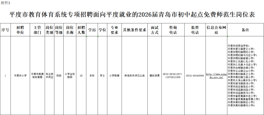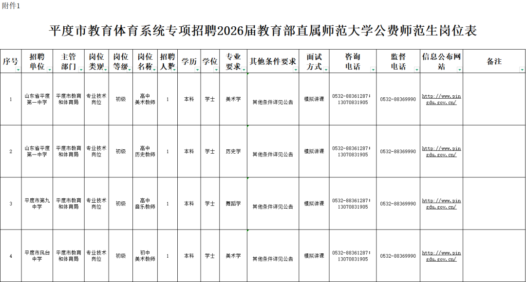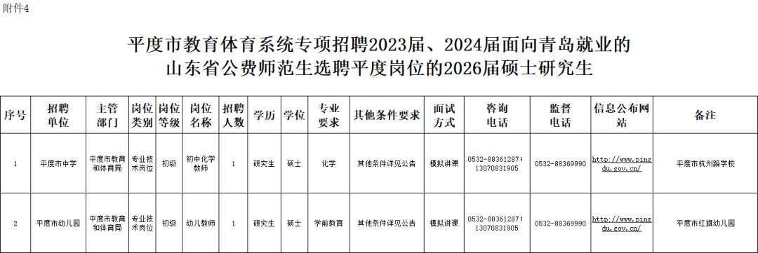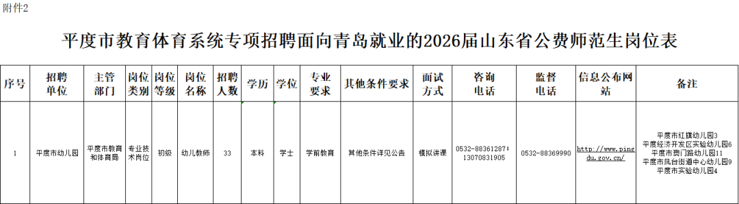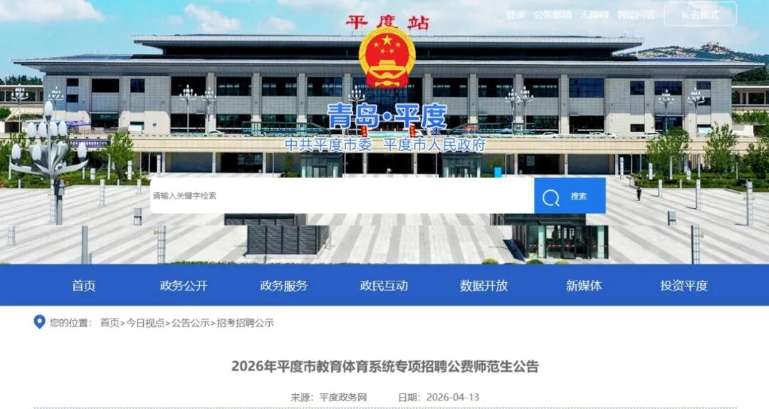 根据事业单位公开招聘有关规定,结合平度市教育体育系统事业单位岗位空缺情况和工作需要,2026年平度市教育体育系统专项招聘公费师范生64人。其中,专项招聘教育部直属师范大学公费师范生事业编制中学教师4人;专项招聘面向青岛就业的2026届山东省公费师范生人员控制总量备案管理幼儿园教师33人;专项招聘面向平度就业的2026届青岛市初中起点免费师范生事业编制小学教师25人;专项招聘2023届面向青岛就业的山东省公费师范生选聘平度岗位的2026届硕士研究生事业编制中学教师1人、2024届面向青岛就业的山东省公费师范生选聘平度岗位的2026届硕士研究生人员控制总量备案管理幼儿园教师1人。