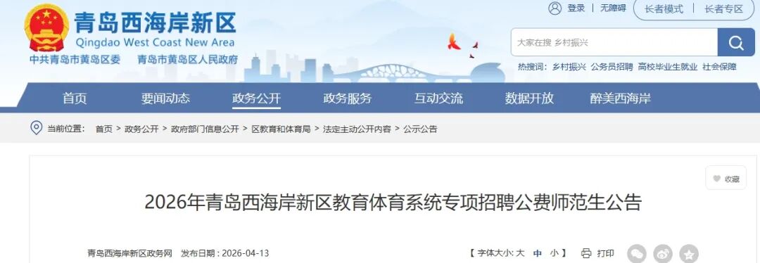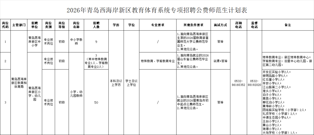 根据《事业单位人事管理条例》(国务院令第652号)、《事业单位公开招聘人员暂行规定》(原人事部令第6号)、《中共山东省委山东省人民政府关于全面深化新时代全省教师队伍建设改革的实施意见》等文件要求,遵照公平、公开、公正招聘原则,青岛西海岸新区教育体育系统专项招聘2026届公费师范生62人。
