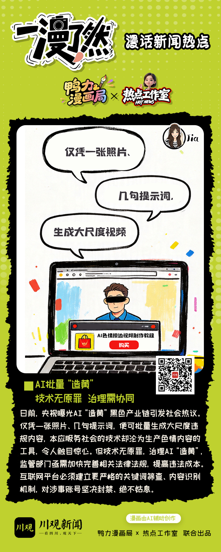 AI功能强大,什么都可以生成,所以是双刃剑,必须管好它,利用AI“造黄”的人是违法犯罪的人,一定会受到应有的处罚!