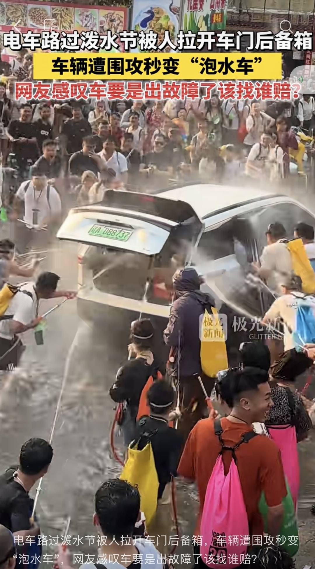 车主驾驶电动汽车正常行驶中,后备箱被猝不及防地打开,一群人使用高压水枪向车内持续喷水,这样一幕近日发生在云南西双版纳的泼水节现场。