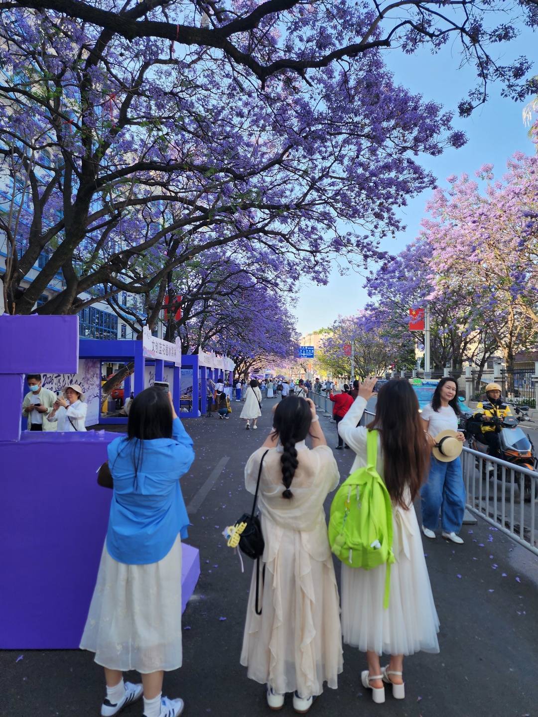 然而,有多名网友发视频称,航天北路“没法赏花”了:近几天,这条路上观赏蓝花楹的最佳位置,都被临时搭建的摊位和高高的梯子挡了,“最佳位置都被搭架和文创集装箱挡完了,还怎么赏花?通过缝隙里观赏吗?”