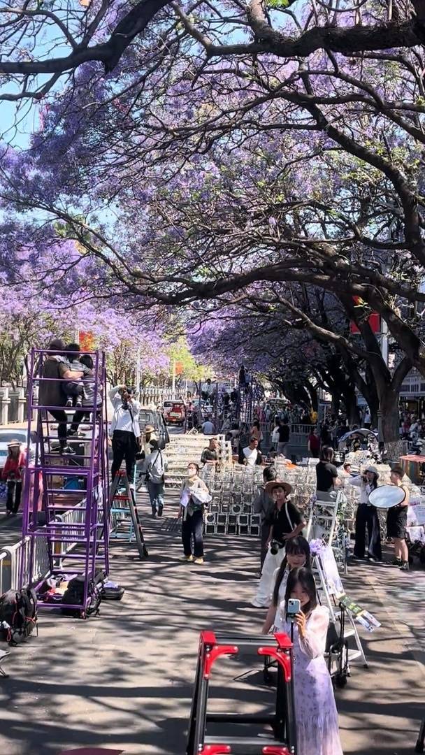 又到今年赏花季,4月15日,多名网友发视频称,在西昌蓝花楹最佳观赏点航天北路,搭建的梯子和摊位占据了约一半路面,赏花位置“被挡完了”,上梯子拍照还要每人收费20元。