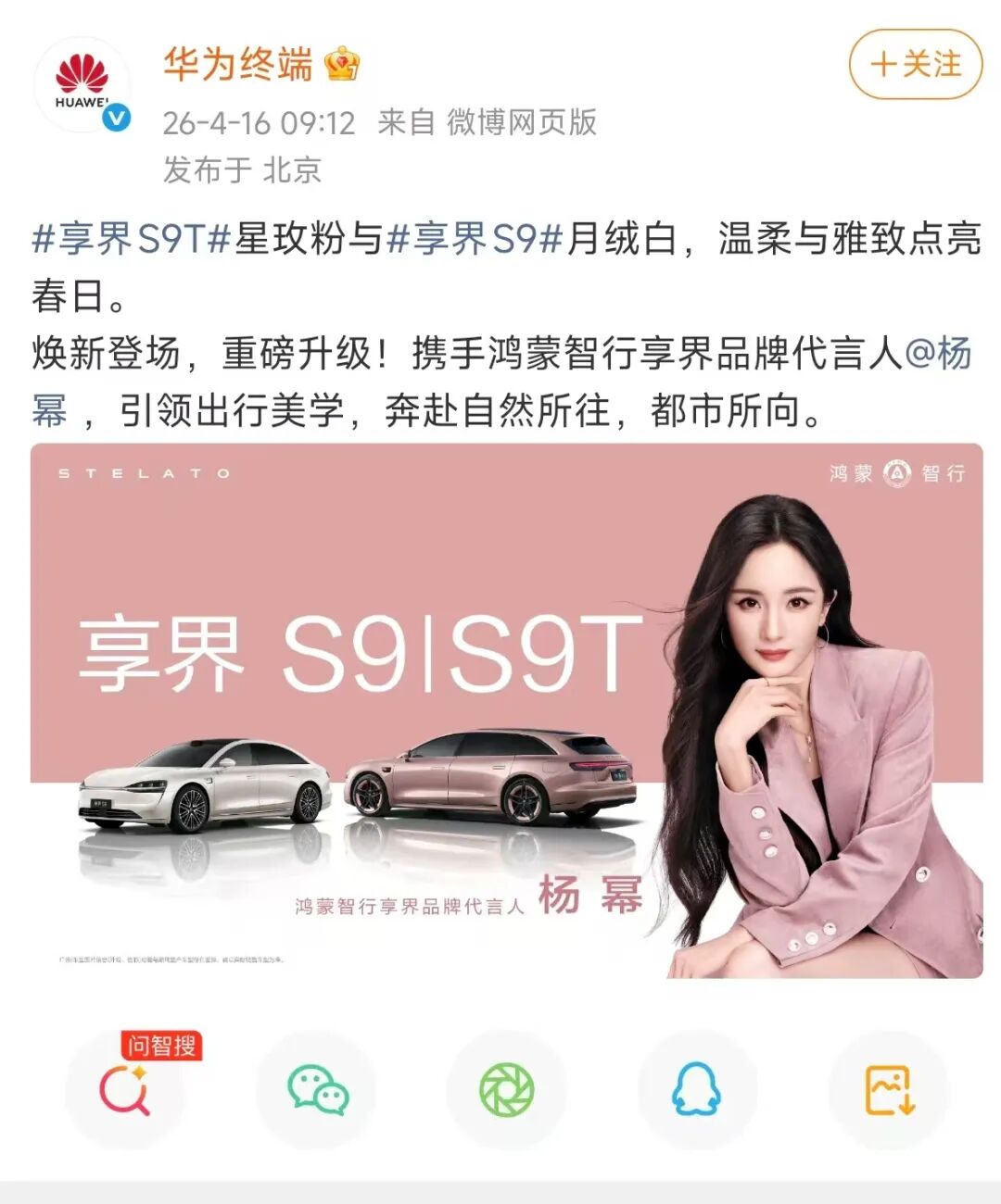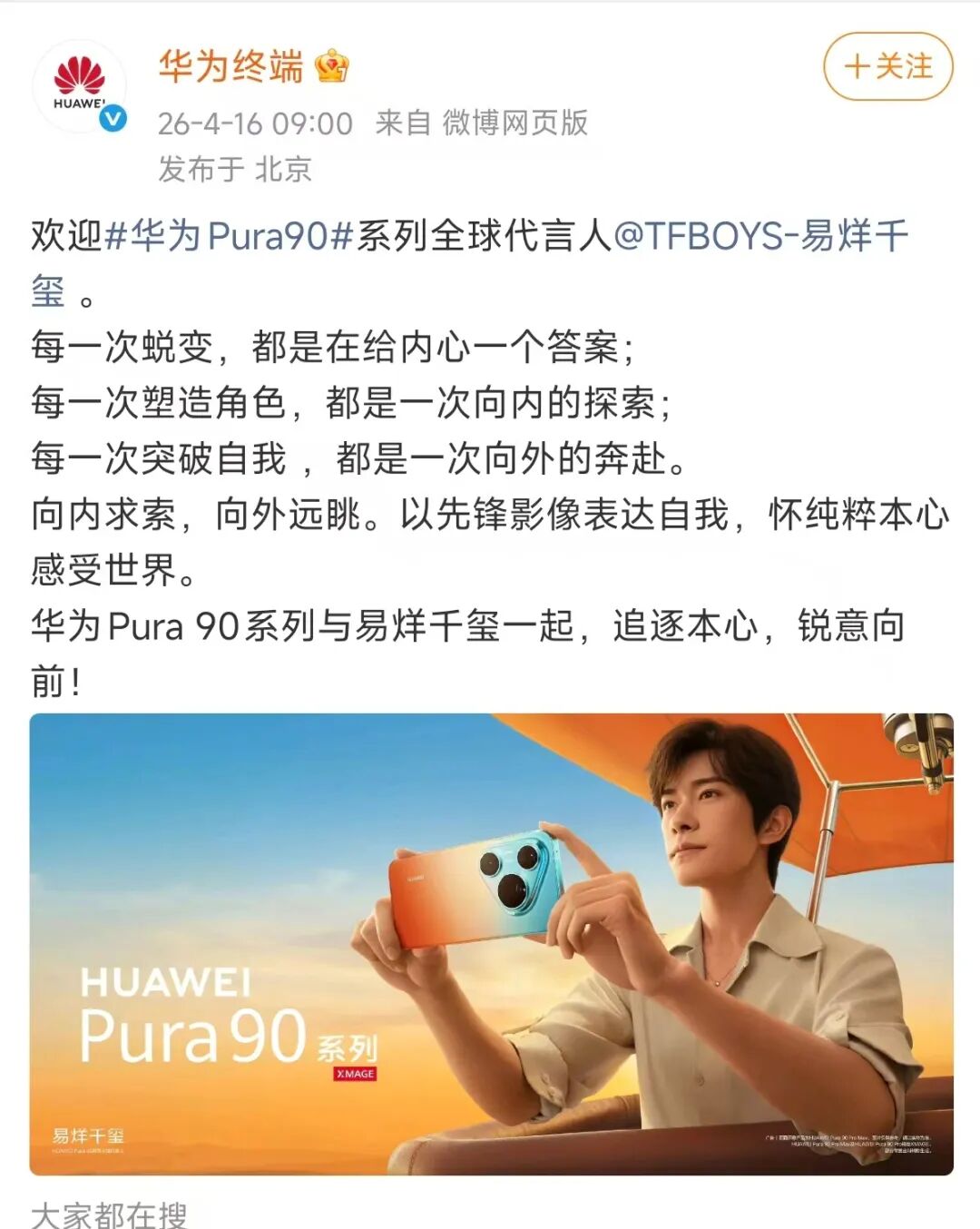 4月16日,华为正式官宣杨幂成为享界品牌代言人,易烊千玺成为华为Pura 90系列全球代言人。双方共同演绎“橘子海”松弛美学,通过纯粹、突破、独创、先锋的同频气质,传递“追逐本心,锐意向前”的品牌理念。