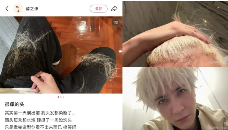 4月9日,薛之谦在社交平台发文晒图,称自己满头斑秃和水泡:很痒的头,其实第一天演出前,我头发都染断了……满头斑秃和水泡,硬挺了一周没洗头,只是做完造型你看不出来而已,搞笑吧!