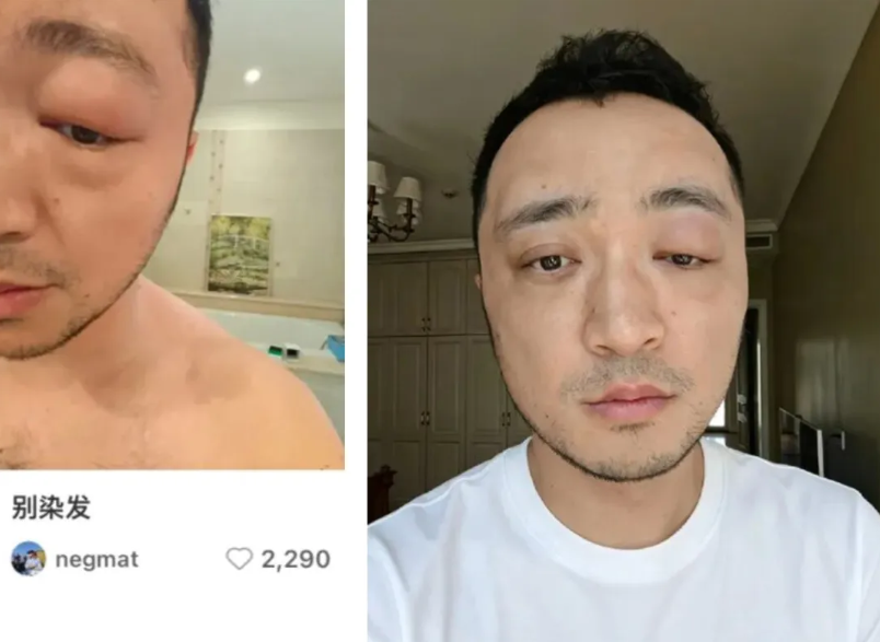 4月15日,主持人尼格买提晒出自己眼部肿胀的照片并配文:别染发。随后,尼格买提在评论区补充:去年的照片,当时染发剂过敏了。