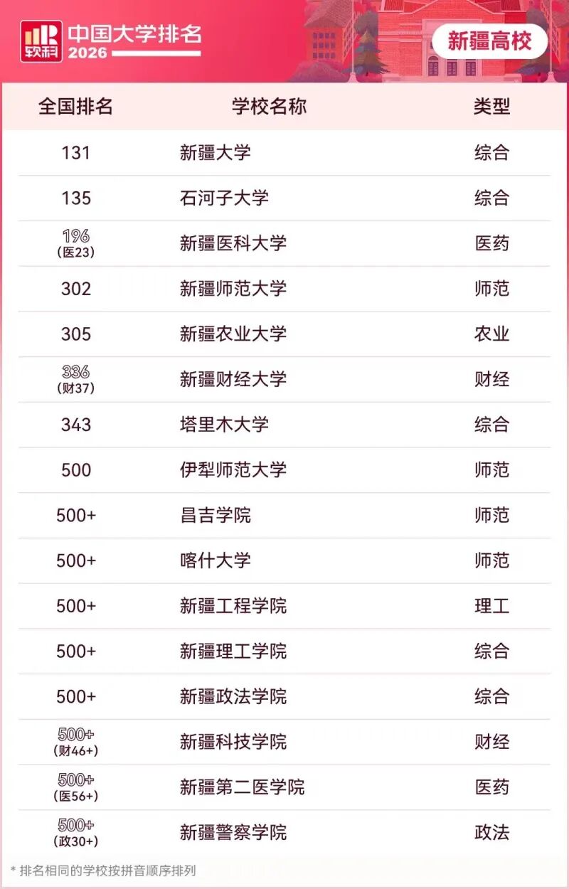 4月15日,2026软科中国大学排名发布,今年新疆共有16所高校上榜,其中11所高校跻身主榜,即综合性大学排名,5所高校上榜单科性大学排名。