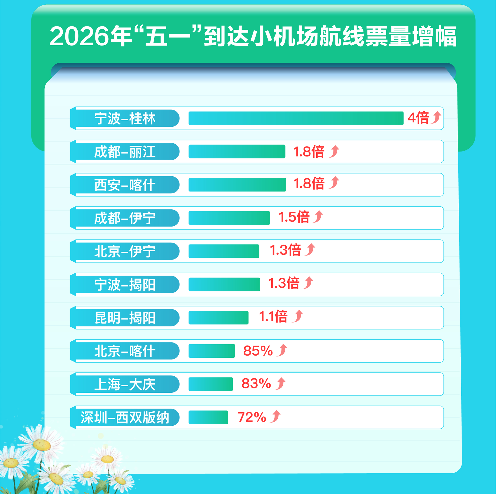 目前,宁波飞往桂林机票预订量同比增长4倍,成都飞往丽江机票预订量同比增长1.8倍,成都飞往伊宁机票预订量同比增长1.5倍。