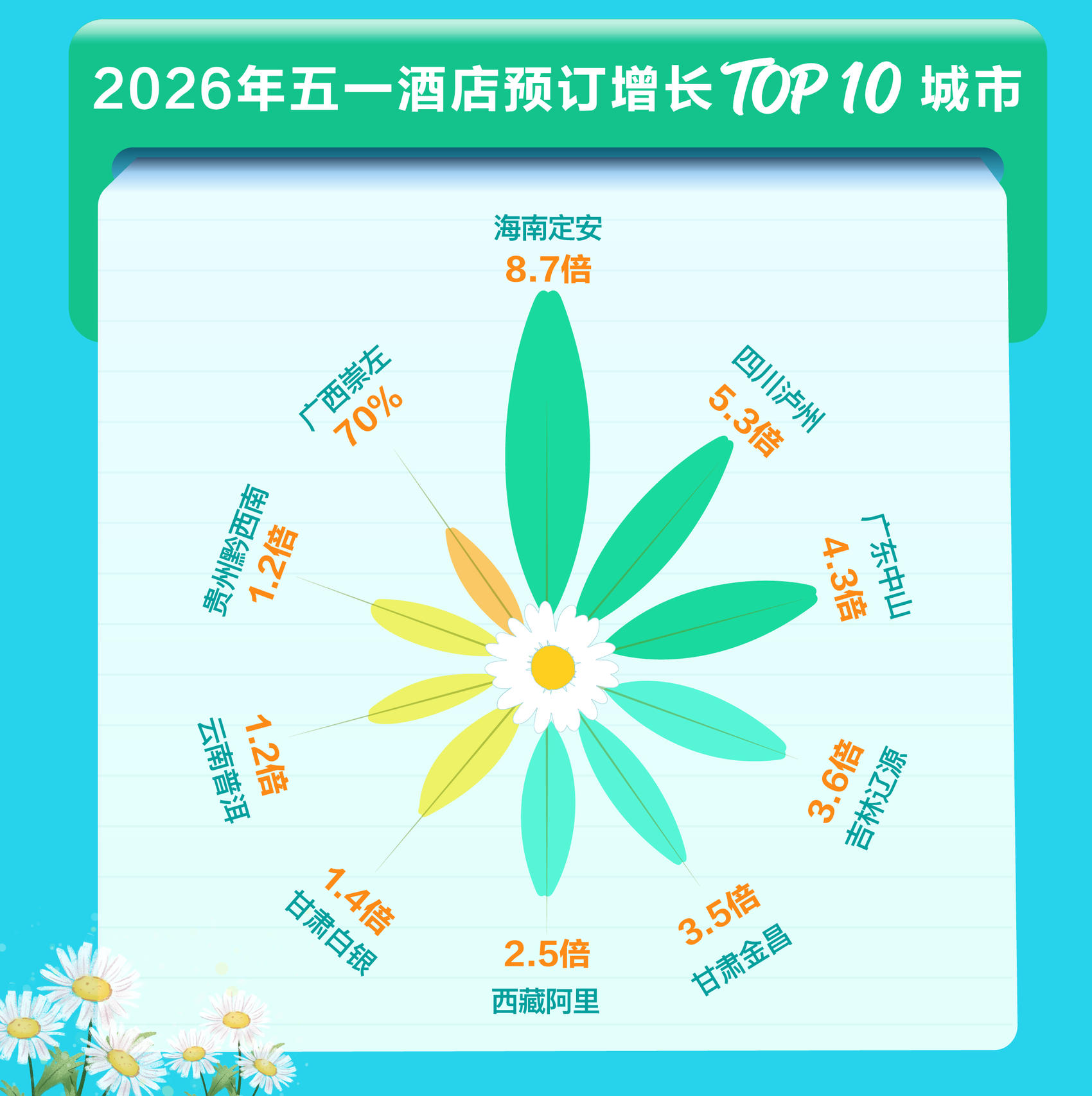 从酒店预订来看,小城市更火热。“五一”期间,集古镇美食和酒文化为一身的泸州酒店预订量增长了5.3倍。此外,主打热带慢生活的海南定安酒店预订量同比增长8.7倍,岭南人文名城中山的酒店预订量也增长了4.3倍。目前,“五一”假期酒店预订已覆盖全国千余个县城,热门地包括福建平潭、广西阳朔、四川九寨沟、新疆新源、江西婺源等。