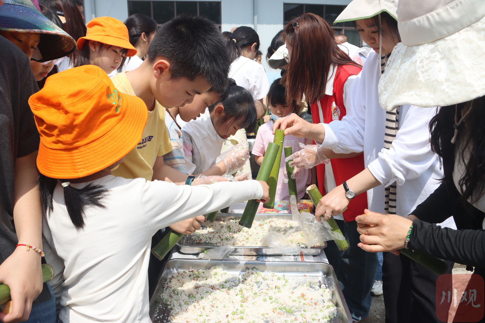 家长和孩子们在制作竹筒饭。灵应寺社区供图