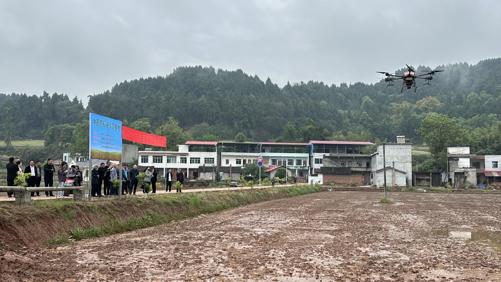 这不是普通的播种现场。村干部们站在田埂上,手里捏着一份特殊的种植方案;村民们三三两两围在路边,眼神里既期待又忐忑。无人机播下的,是被村民们称为“中药稻”的稻种——从育苗到成熟,它们将“喝”着中药营养液、“吃”着生物菌有机肥长大,全生育周期不用一滴化学农药。
