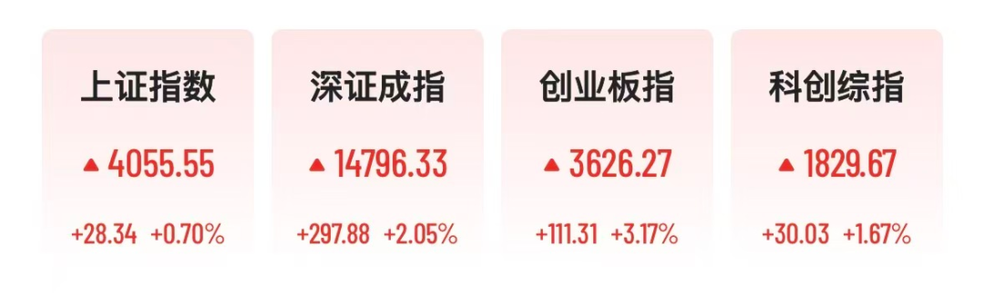 A股市场集体反弹。截至收盘,沪指涨0.7%,深成指涨2.05%,创业板指涨3.17%继续刷新近11年新高,科创综指涨1.67%。沪深两市成交额2.34万亿元,较上一个交易日缩量736亿元。全市场近4300只个股上涨。港股恒生指数盘中涨超1.7%,恒生科技指数涨超3.5%。