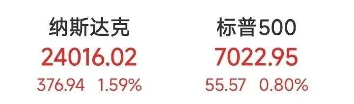 截至收盘,纳指涨376.94点,涨幅为1.59%,报24016.02点;标普500指数涨55.57点,涨幅为0.80%,报7022.95点。